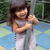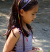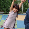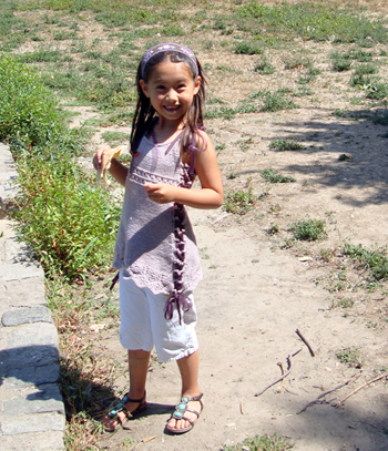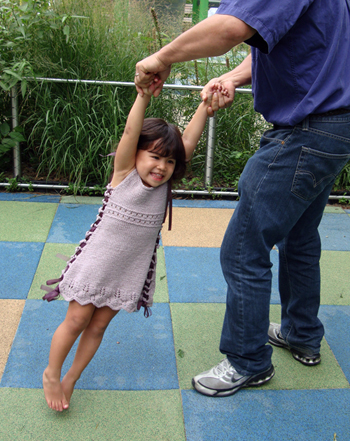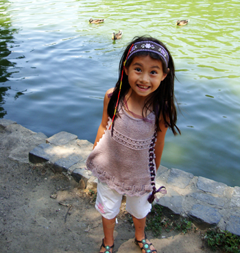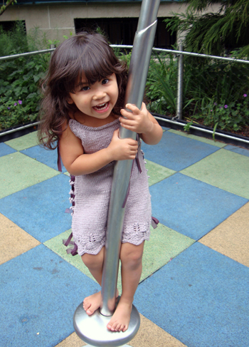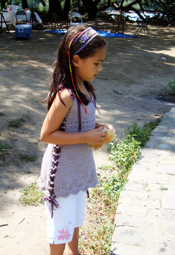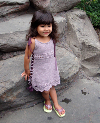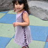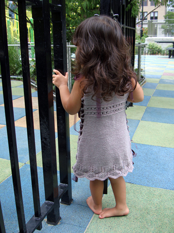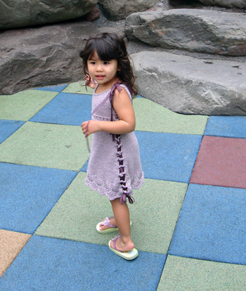 This garment’s fit is uniquely expandable. It begins as a dress for a 12 month old and can be widened to accommodate the growing child, eventually becoming a tunic fitting a child up to size 6. A ribbon or i‑cord laces through the decorative side loops and creates a wonderful look that allows for the expansion of the garment as the child matures.