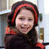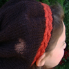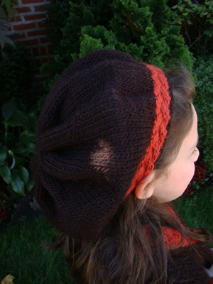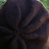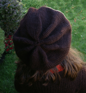 The beret has a cable band that is knit flat and grafted together. Then, stitches are picked up and is knit in the round. The severe decrease gives it a gathered look.